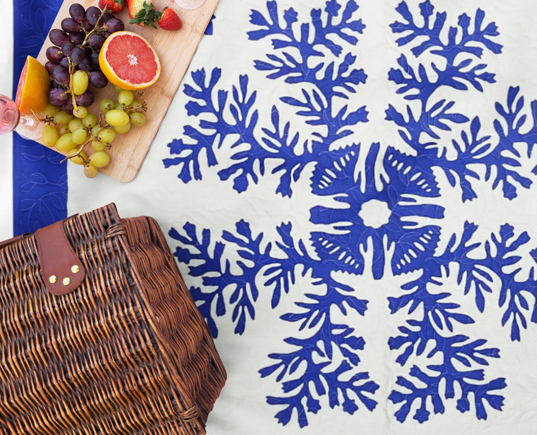 The quilt makers cloth is folded, and inspiration for the actual designs are taken from nature objects such as the leaves and vines of native plants. The quilt maker then snips and cuts this folded design fabric to reveal their unique masterpiece when the fabric is unfolded. To create their finished quilt top design, this cut design fabric is layered upon another background fabric of equal size, then the design fabric is then painstakingly hand appliqued to the top fabric with needle turn and reverse applique techniques to create the finished design.