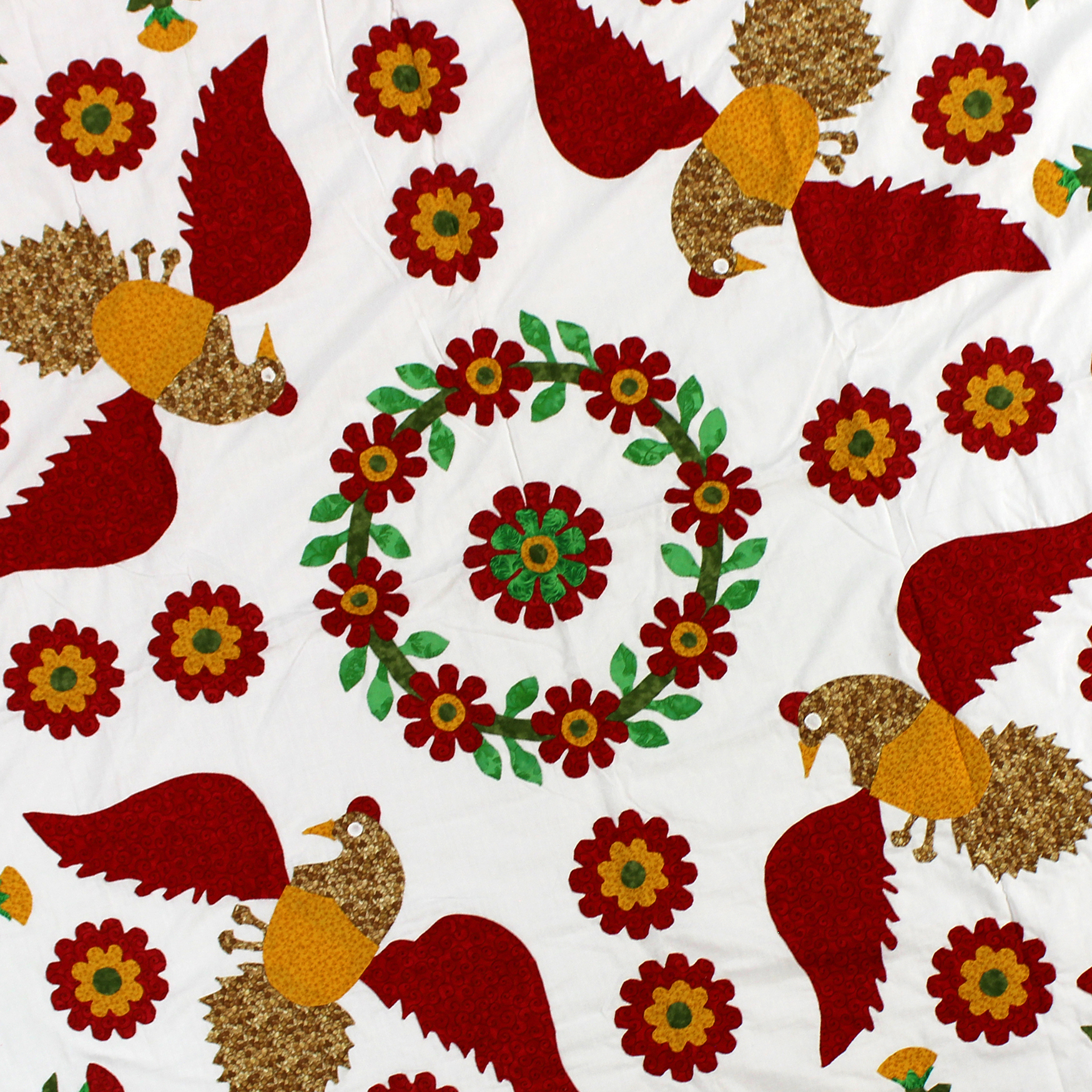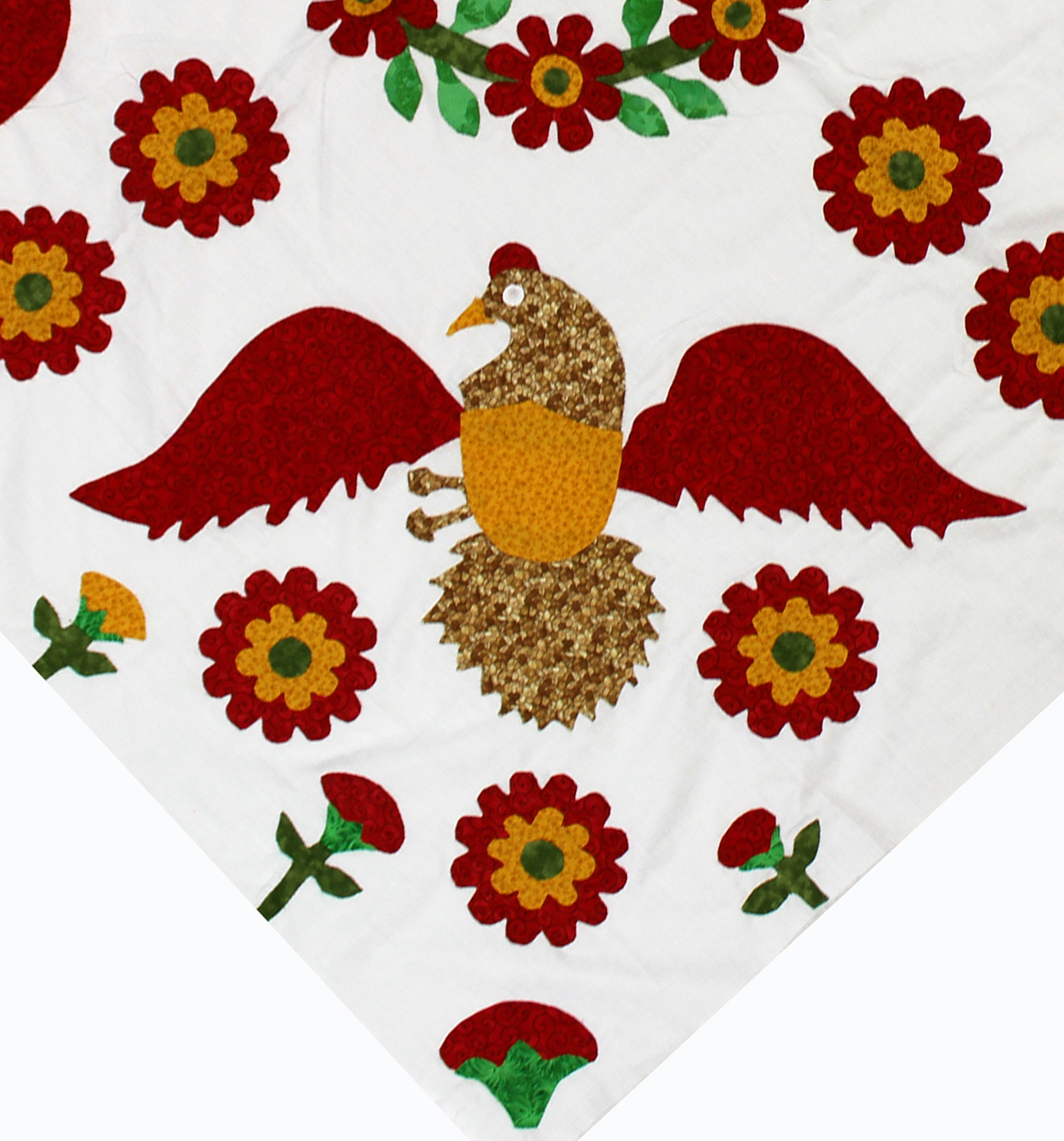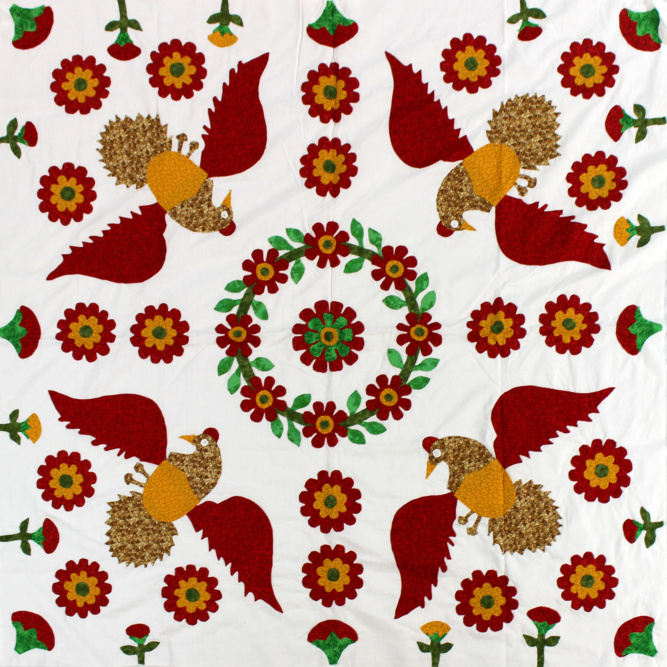 This is our newest floral hand applique Eagle wall or lap quilt top. It is the perfect patriotic canvas to showcase your hand or machine quilting skills upon. Made with 100% cotton fabrics. You will appreciate the small detailed hand applique stitches using the traditional needle turn applique techniques..