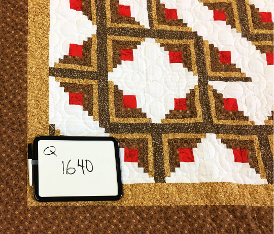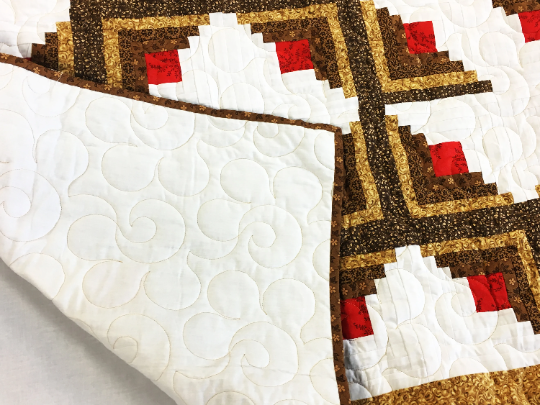 This Earth tone Log Cabin quilt is large at 90″ x 90″ and is a finished quilt ready to be enjoyed by your family. It is made in 100% cotton fabrics, and is exceptional every detail. It will be cherished for generations to come.