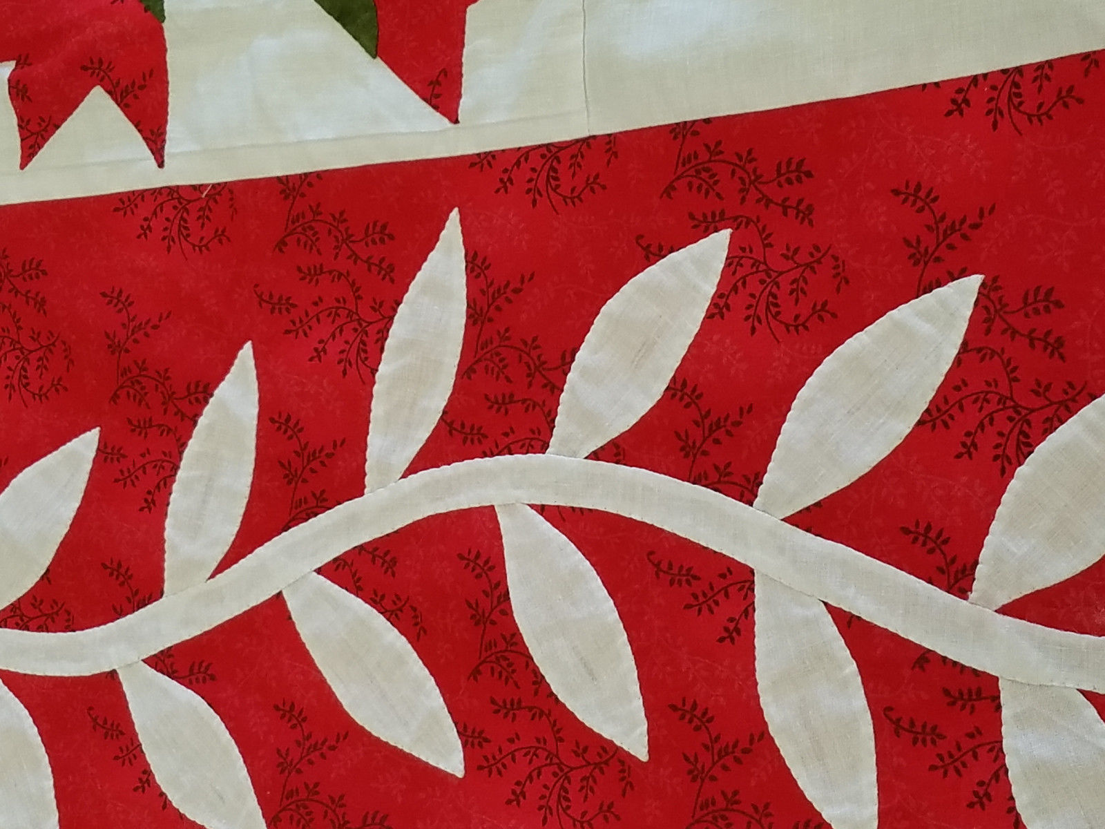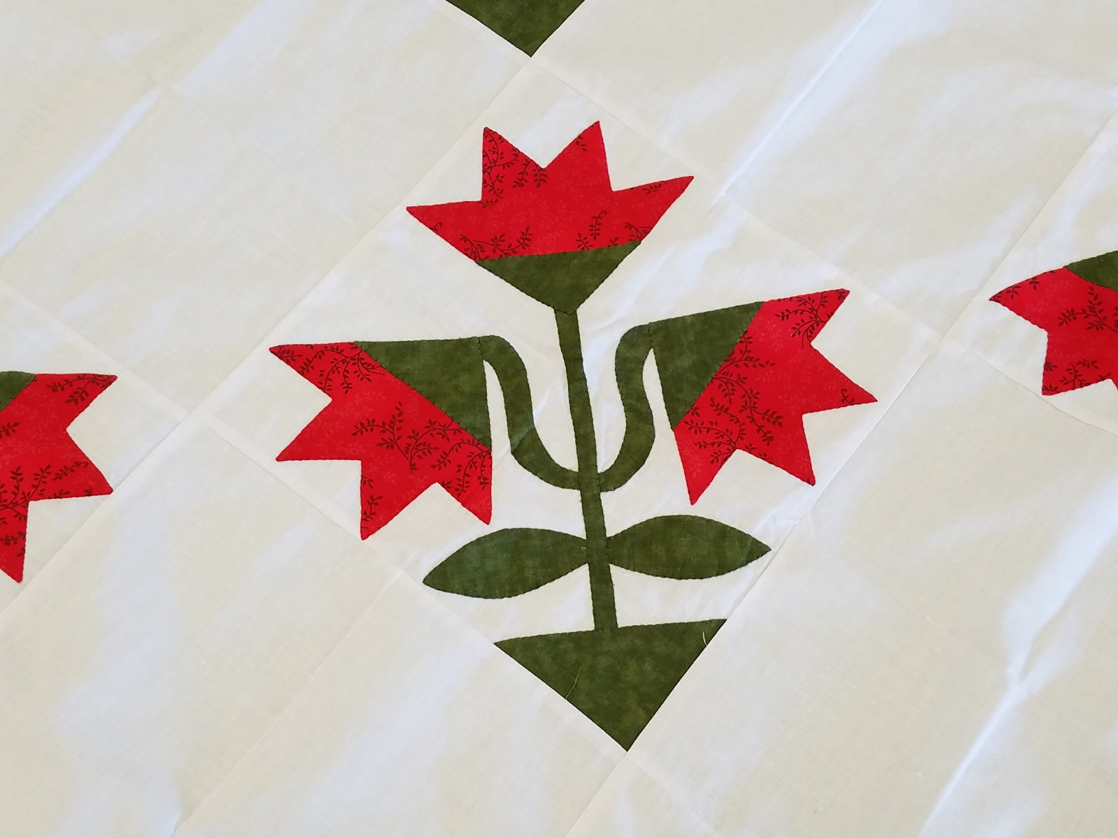 This is a large 92″ x 92″ Hand Applique Carolina Lily quilt top. It is made in 100% cotton fabrics, and is exceptional in most every detail. It will be cherished for generations to come.