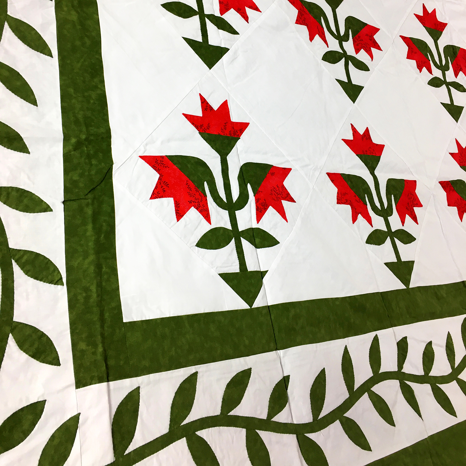 This is a large 92″ x 92″ Hand Applique Carolina Lily quilt top. It is made with 100% cotton fabrics, and is exceptional in every detail. It will be cherished for generations to come.