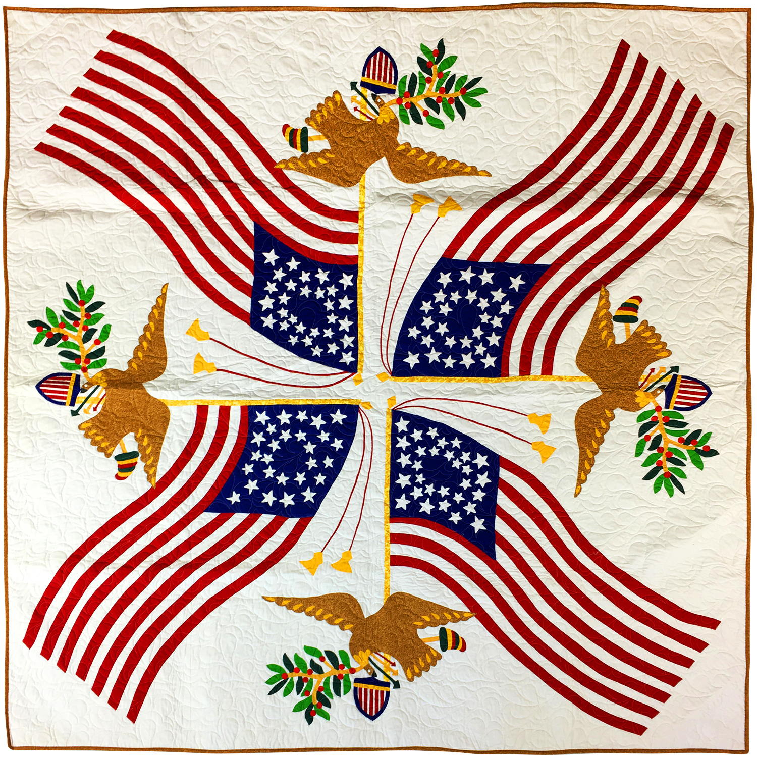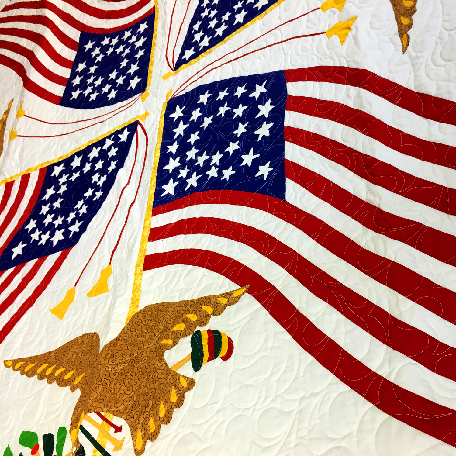 It is a finished needle turned Hand Applique quilt has incredible long arm quilting and a nice flag and eagle details. Made with 100% cotton fabrics, is exceptional in every detail,and will be cherished for generations to come.