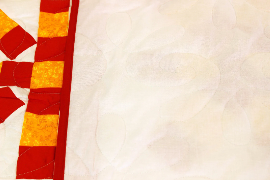 This example has wonderful whole cloth backing, Clear quilting thread to enhance the design, cotton batting & small traditional quilting.