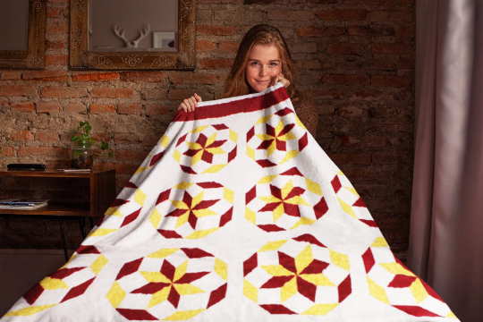This quilt is a large 86″ x 86″ finished quilt top. It is made from 100% Cotton fabrics and is exceptional in every detail. This unique limited edition quilt become a prize in any quilt collection.