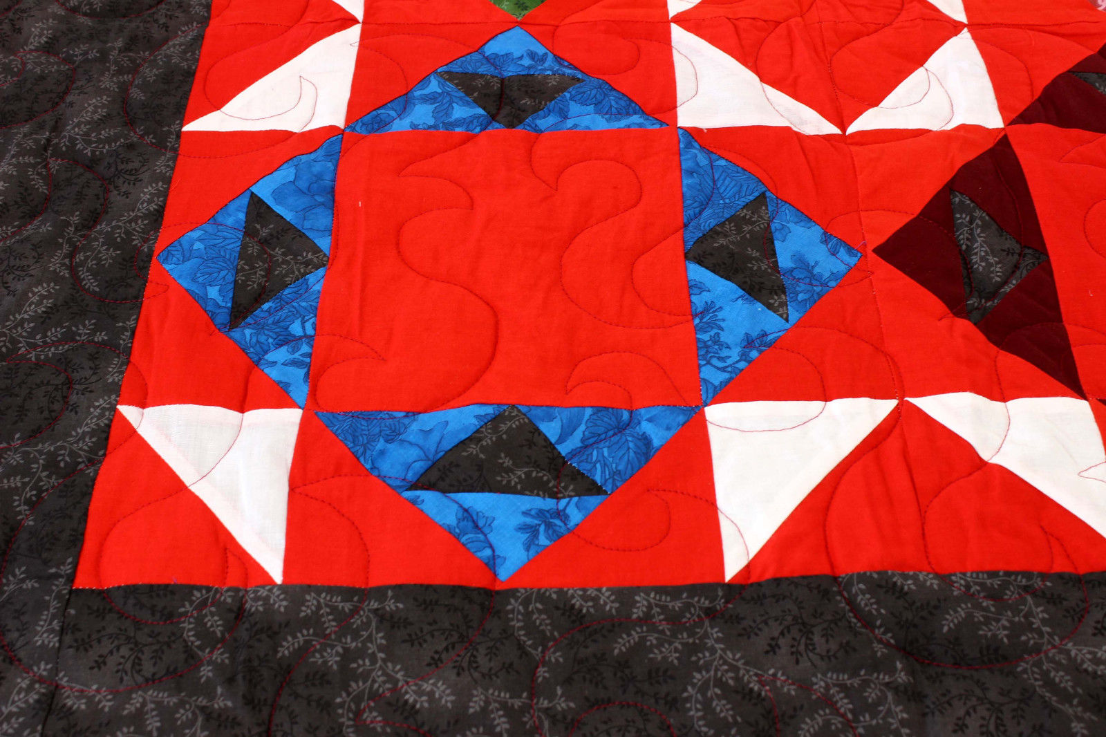 This example has wonderful whole cloth backing, Clear quilting thread to enhance the design, cotton batting & small traditional quilting.