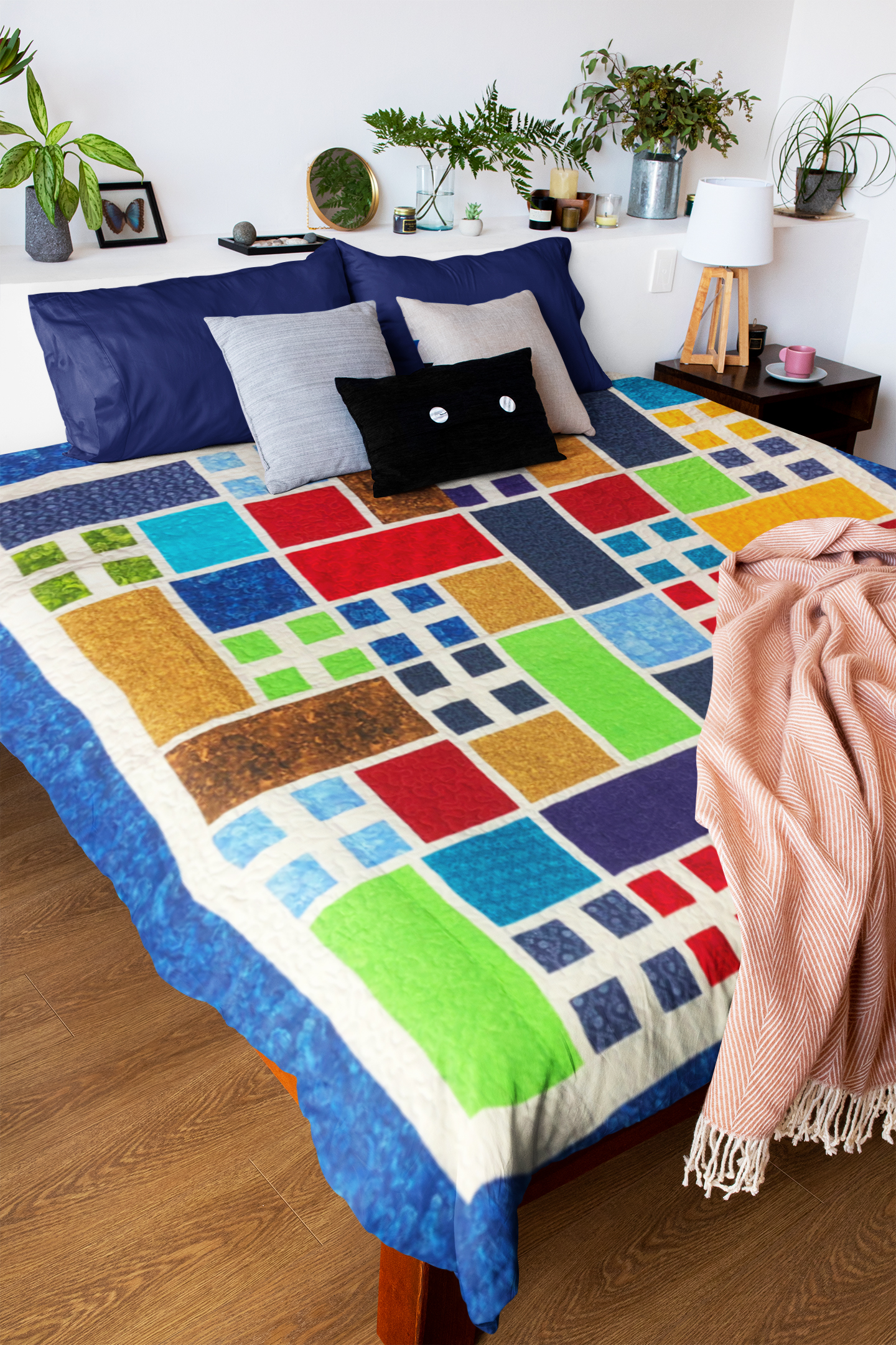 This quilt is a large 90″ x 90″ quilt. It is made with 100% cotton fabrics, and is exceptional in every detail. It will be cherished for generations to come.