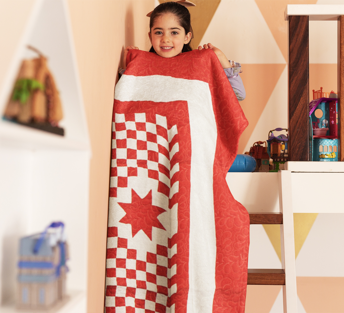 This quilt is large at 88″ x 88″ and is a finished quilt ready to be enjoyed by your family. It is made in 100% cotton fabrics, and is exceptional every detail. It will be cherished for generations to come.