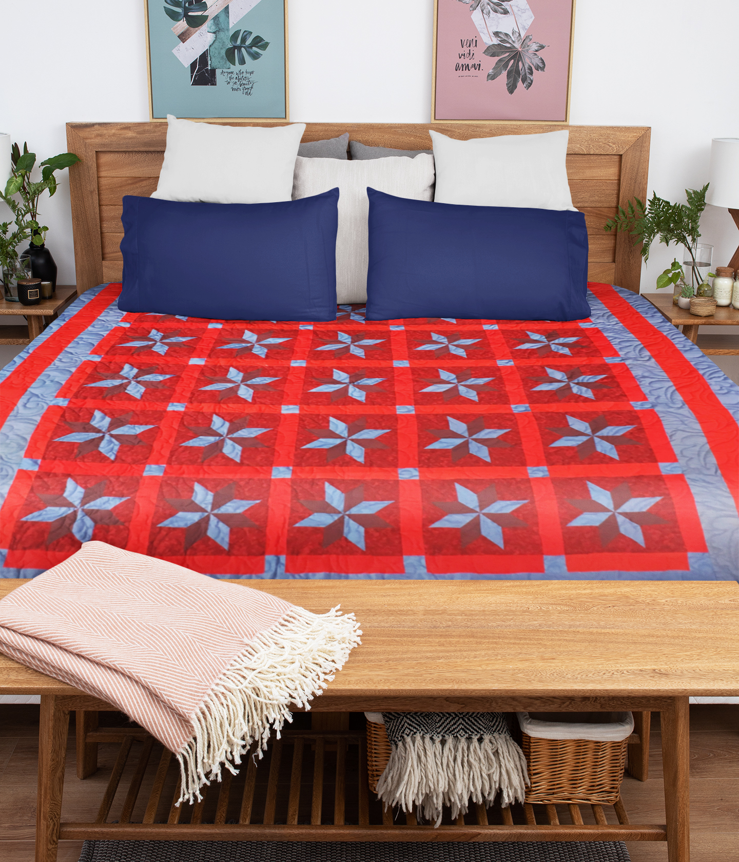 This is a large 86″ x 86″ patchwork finished quilt. It is made in 100% cotton fabrics, and is exceptional in every detail. It will be cherished for generations to come.