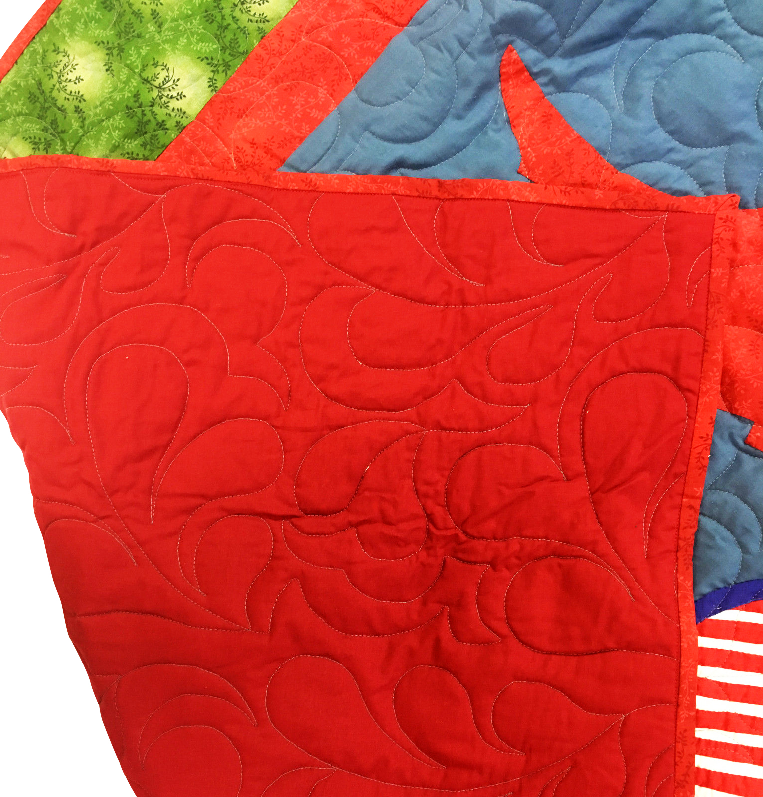 This example has wonderful whole cloth backing, cotton batting & small traditional quilting.
