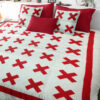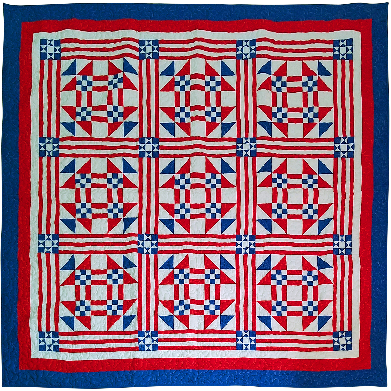 This quilt is large at 90″ x 90″ and is a finished quilt ready to be enjoyed by your family. It is made with cotton blended fabrics, and is exceptional in every detail. It will be cherished for generations to come.